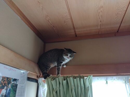 カーテンはなくてもジャンプの身体能力は高いので、ケージに上がりそこからレールを闊歩している。